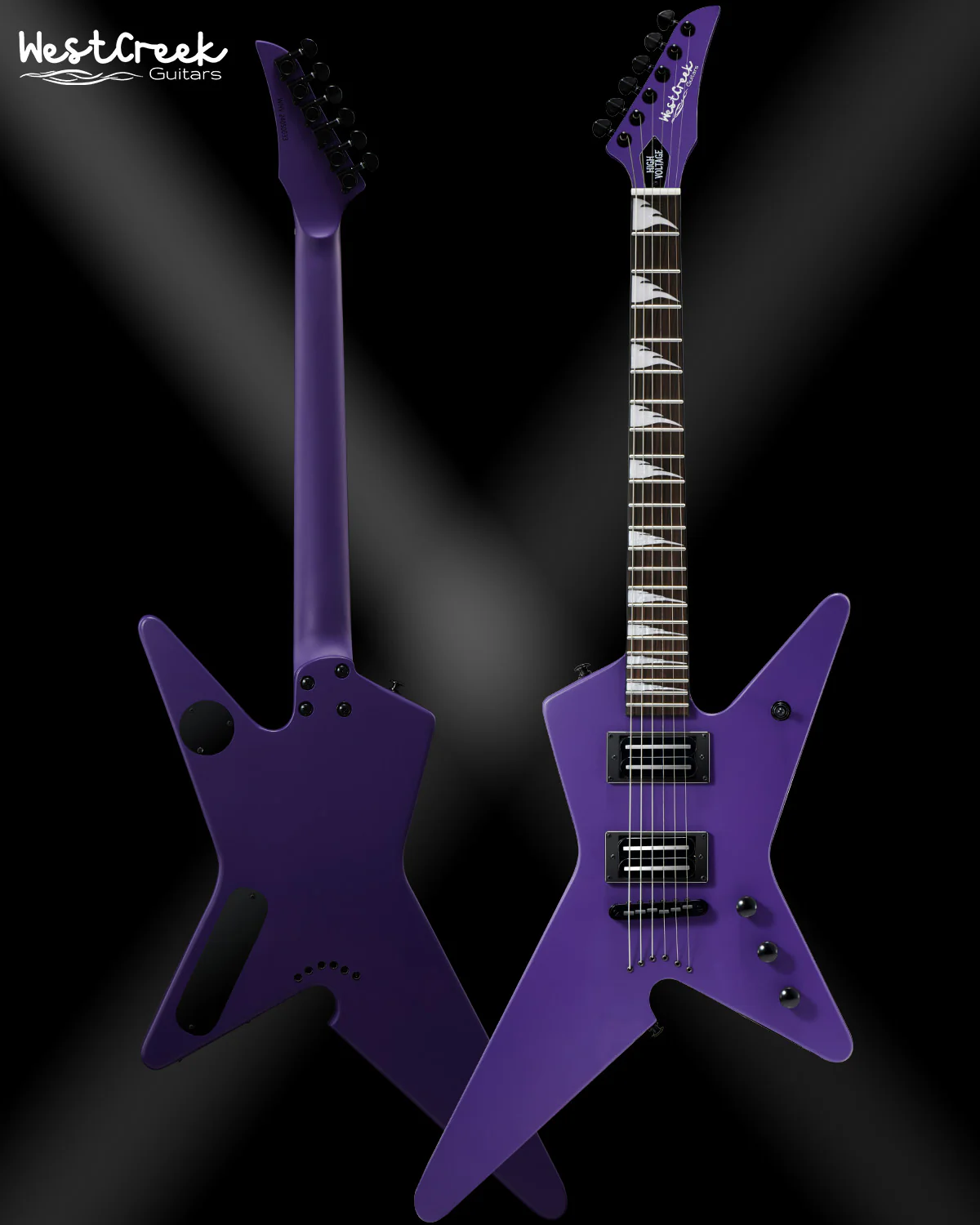 WestCreek HIGH VOLTAGE (HV) electric guitar Introdution: Unleash with the WestCreek HIGH VOLTAGE, a guitar crafted for the adrenaline-fueled world of heavy metal. Available in Grape, Black, and Green finishes, this instrument commands attention both visually and sonically.